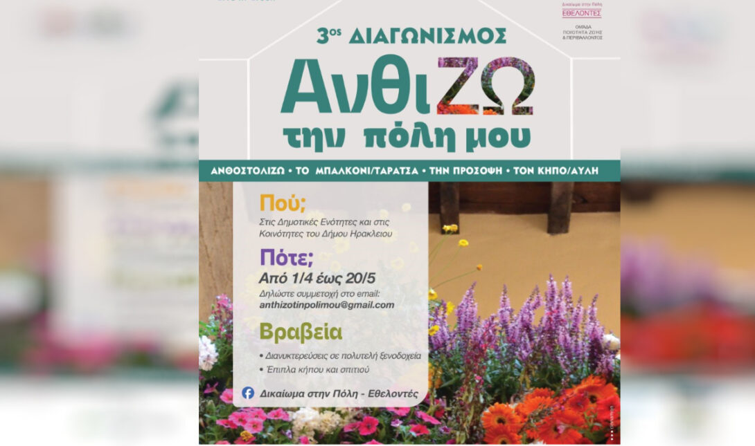 Για τρίτη συνεχόμενη χρονιά, η Ομάδα Περιβάλλοντος και Ποιότητας Ζωής «Δικαίωμα στην Πόλη – Εθελοντές» διοργανώνει τον επιτυχημένο διαγωνισμό «ΑνθίΖω την πόλη μου», προσκαλώντας τους πολίτες του Δήμου Ηρακλείου να συμβάλουν ενεργά στη δημιουργία μιας πιο πράσινης και βιώσιμης πόλης.