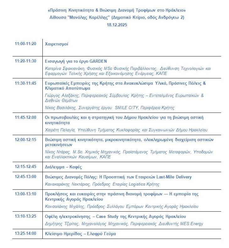 Η εκδήλωση πραγματοποιείται στο πλαίσιο του Ευρωπαϊκού Έργου Interreg Euro-MED GARDEN, στο οποίο συμμετέχουν το ΚΑΠΕ και ο «ΑΟΤΑ Ηράκλειο ΜΑΕ». Το έργο εστιάζει στη βελτίωση της εφοδιαστικής αλυσίδας των τοπικών αγορών τροφίμων μέσα από την εφαρμογή «πράσινων λύσεων», όπως η χρήση ηλεκτρικών οχημάτων, βιοκαυσίμων, βέλτιστων δρομολογίων μέσω ψηφιακών εργαλείων, καθώς και πρακτικών last mile delivery με μέσα χαμηλών εκπομπών.