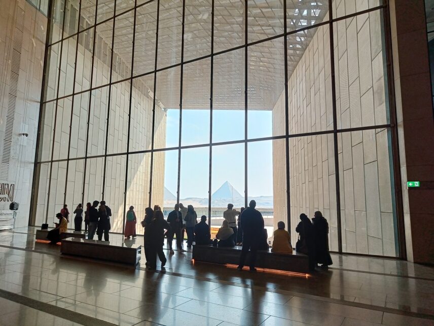 Από εκεί, αποκαλύπτεται ένα από τα πιο μαγευτικά θεάματα που μπορεί να δει το ανθρώπινο μάτι, η θέα των Πυραμίδων της Γκίζας μέσα από τη γυάλινη πρόσοψη του μουσείου.