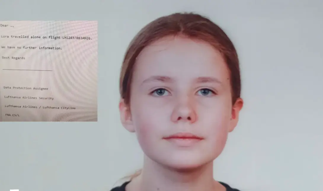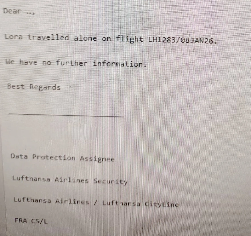 Στο μήνυμα που δημοσιεύει το protothema.gr, η Lufthansa φαίνεται να απαντά λιτά προς την ΕΛ.ΑΣ. πως «η Λόρα ταξίδεψε μόνη της στην πτήση LH1283 στις 8 Ιανουαρίου 2026. Δεν έχουμε περισσότερες πληροφορίες. Με εκτίμηση».