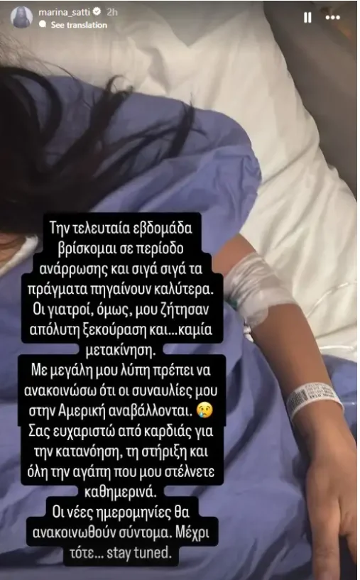 «Tην τελευταία εβδομάδα βρίσκομαι σε περίοδο ανάρρωσης και σιγά σιγά τα πράγματα πηγαίνουν καλύτερα. Οι γιατροί, όμως, μου ζήτησαν απόλυτη ξεκούραση και καμιά μετακίνηση. Με μεγάλη μου λύπη πρέπει να ανακοινώσω ότι οι συναυλίες μου στην Αμερική αναβάλλονται. Σας ευχαριστώ από καρδιάς για την κατανόηση, τη στήριξη και όλη την αγάπη μου στέλνετε καθημερινά. Οι νέες ημερομηνίες θα ανακοινωθούν σύντομα. Μέχρι τότε… stay tuned», έγραψε στην ανάρτησή της η Μαρίνα Σάττι.