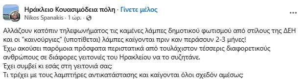 Και ναι αλλάζουν κατόπιν τηλεφωνήματος οι καμένες λάμπες δημοτικού φωτισμού σε στύλους της ΔΕΗ στο Ηράκλειο αλλά σύμφωνα με όσα λένε αρκετοί κάτοικοι, οι «καινούργιες» λάμπες καίγονται μέσα σε λίγους μήνες.