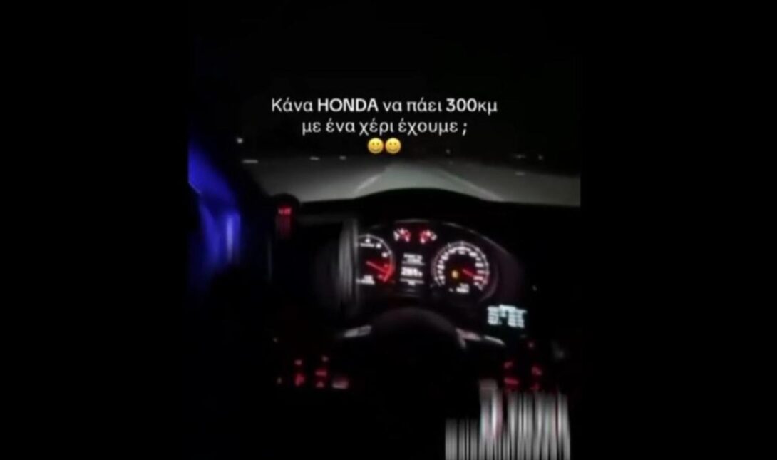 Η εικόνα γίνεται ακόμη πιο ανησυχητική, καθώς ο οδηγός κρατά το τιμόνι με το ένα χέρι, ενώ με το άλλο τραβά βίντεο με το κινητό του. Στη λεζάντα του βίντεο, σε ύφος επίδειξης, γράφει: «Έχουμε καμιά Honda που να πιάνει 300 με ένα χέρι;», συνοδεύοντας τη φράση με emojis.