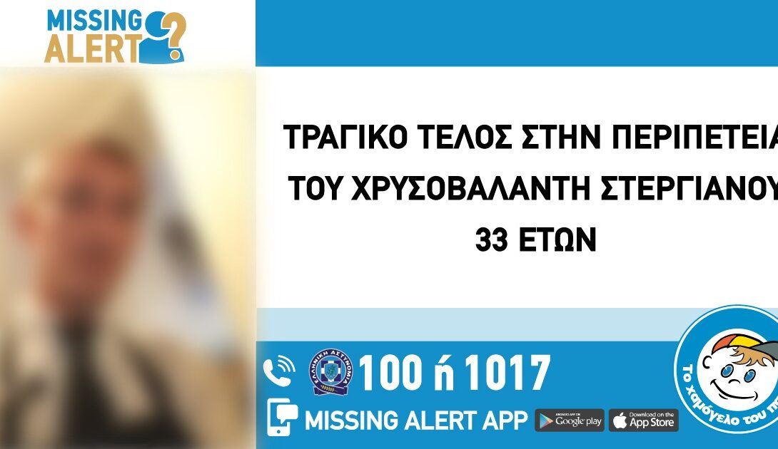 Τραγικός επίλογος γράφτηκε για την υπόθεση της εξαφάνισης του 33χρονου Χρυσοβαλάντη Στεργιανού, ο οποίος εντοπίστηκε νεκρός σκορπίζοντας βαρύ πένθος στην οικογένεια και στους ανθρώπους που τον αναζητούσαν επί εβδομάδες.