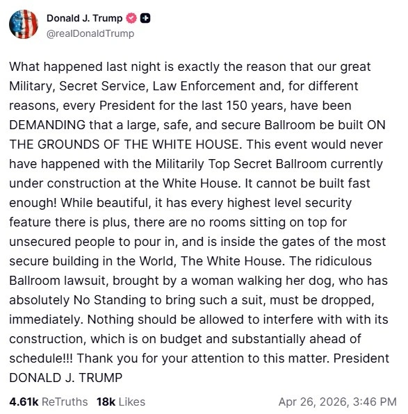 «Αυτό που συνέβη χθες το βράδυ είναι ακριβώς ο λόγος για τον οποίο ο σπουδαίος Στρατός μας, η Μυστική Υπηρεσία, οι Αρχές Επιβολής του Νόμου και, για διαφορετικούς λόγους, κάθε Πρόεδρος τα τελευταία 150 χρόνια, ΑΠΑΙΤΟΥΝ να κατασκευαστεί μια μεγάλη, ασφαλής και προστατευμένη αίθουσα δεξιώσεων ΕΝΤΟΣ ΤΩΝ ΟΡΙΩΝ ΤΟΥ ΛΕΥΚΟΥ ΟΙΚΟΥ», έγραψε στο Truth Social ο Τραμπ.