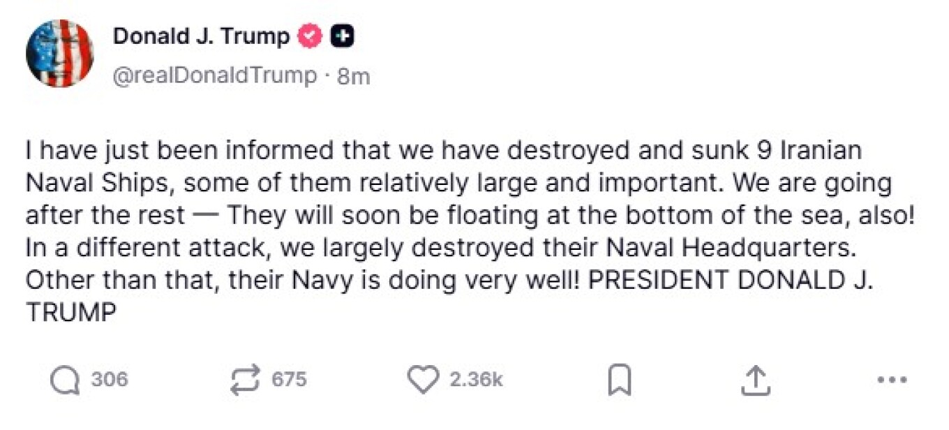 Τη βύθιση εννέα ιρανικών πολεμικών πλοίων ανακοίνωσε μέσω ανάρτησής του ο Ντόναλντ Τραμπ, επισημαίνοντας ότι ορισμένα από αυτά ήταν «μεγάλα και ιδιαίτερα σημαντικά» για το ιρανικό ναυτικό.