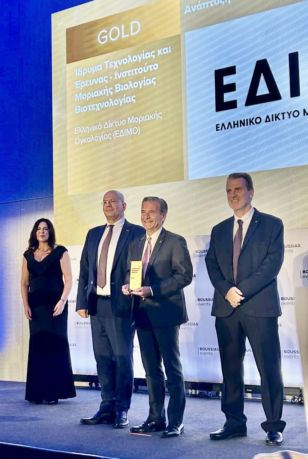 Βραβείο GOLD στην κατηγορία «Ανάπτυξη & Καινοτομία» έλαβε το Ελληνικό Δίκτυο Μοριακής Ογκολογίας (ΕΔΙΜΟ), το οποίο συστάθηκε με πρωτοβουλία του Ινστιτούτου Μοριακής Βιολογίας και Βιοτεχνολογίας του ΙΤΕ, τον Ιούνιο του 2022 και λειτουργεί υπό την εποπτεία της Γενικής Γραμματείας Έρευνας και Καινοτομίας του Υπουργείου Ανάπτυξης. Οι υπηρεσίες του δικτύου συμβάλλουν στην πρόληψη, τη διάγνωση και τη θεραπεία του καρκίνου και στην εξατομίκευση της περίθαλψης των ογκολογικών ασθενών. Με συμμετοχή 8 ερευνητικών και ακαδημαϊκών φορέων και χρηματοδότηση από το Ταμείο Ανάκαμψης, προσφέρει δωρεάν αναλύσεις βιοδεικτών για καρκίνο, συμβάλλοντας στην έγκαιρη διάγνωση, εξατομικευμένη θεραπεία και πρόληψη σε χιλιάδες ασθενείς. Το ψηφιακό μητρώο, η πλατφόρμα κλινικής επισημείωσης γενετικών αποτελεσμάτων και τα αυστηρά πρωτόκολλα προστασίας προσωπικών δεδομένων αναδεικνύουν το ΕΔΙΜΟ σε πρότυπο σύγχρονης, βιώσιμης υγειονομικής φροντίδας. Συνδυάζοντας κοινωνική δικαιοσύνη με την επιστημονική καινοτομία, συμβάλλει ουσιαστικά στη διαμόρφωση της εθνικής στρατηγικής για τον καρκίνο.