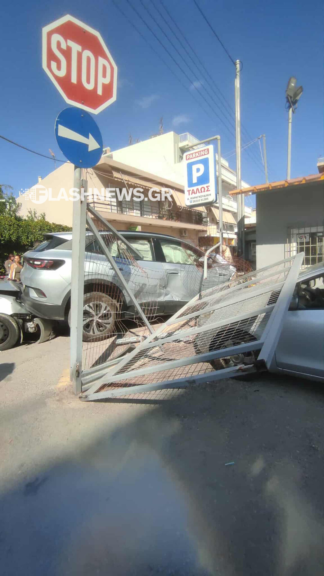 Η σύγκρουση ήταν σφοδρή, με αποτέλεσμα δύο από τα αυτοκίνητα να υποστούν εκτεταμένες ζημιές, ενώ ένα από αυτά κατέληξε στην καγκελόπορτα υπαίθριου πάρκινγκ, προκαλώντας φθορές και στην είσοδο της εγκατάστασης.