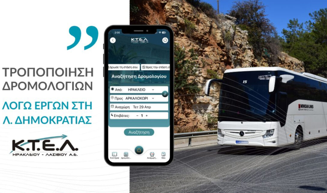 Η ΚΤΕΛ Ηρακλείου Λασιθίου ενημερώνει το επιβατικό κοινό ότι, λόγω εκτέλεσης έργων, η Λεωφόρος Δημοκρατίας (ρεύμα ανόδου) θα παραμείνει κλειστή από 29 Απριλίου και μέχρι νεωτέρας.