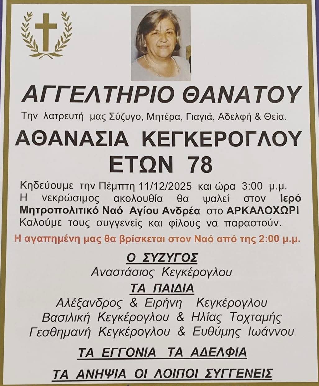 Η νεκρώσιμος ακολουθία θα ψαλεί στον Ιερό Μητροπολιτικό Ναό Αγίου Ανδρέα στο Αρκαλοχώρι.