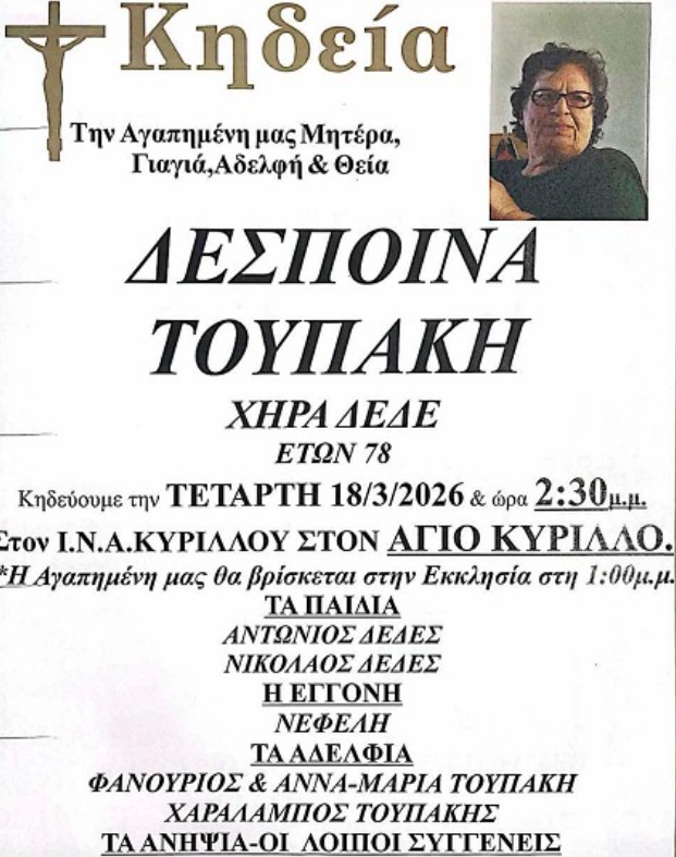 Η εξόδιος ακολουθία θα τελεστεί την Τετάρτη 18 Μαρτίου 2026 και ώρα 14:30, στον Ιερό Ναό Αγίου Κυρίλλου στον Άγιο Κύριλλο.