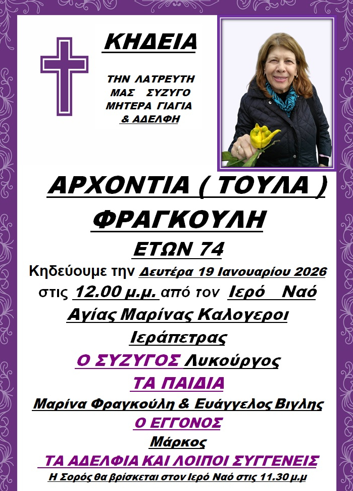 Η εξόδιος ακολουθία θα τελεστεί τη Δευτέρα 19 Ιανουαρίου 2026, στις 12:00 μ.μ., από τον Ιερό Ναό Αγίας Μαρίνας Καλογεροί Ιεράπετρας.