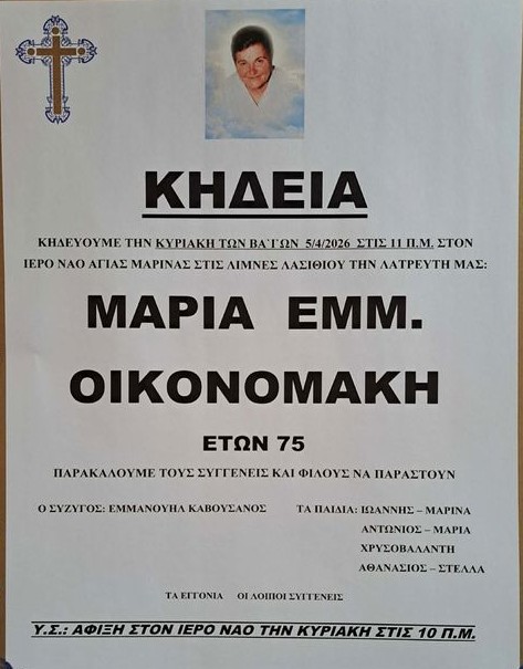 Η κηδεία της εκλιπούσας θα τελεστεί αύριο Κυριακή των Βαίων 5 Απριλίου 2026 στις 11πμ στον Ιερό Ναό Αγίας Μαρίνας στις Λίμνες Λασιθίου.