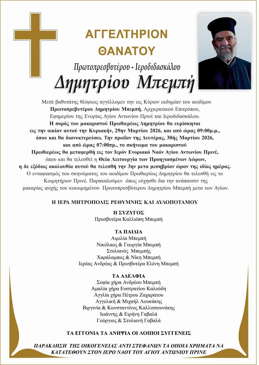 - Ο θάνατος του Πρωτοπρεσβύτερου Δημήτριου Μπεμπή προκάλεσε συγκίνηση στο Ρέθυμνο.