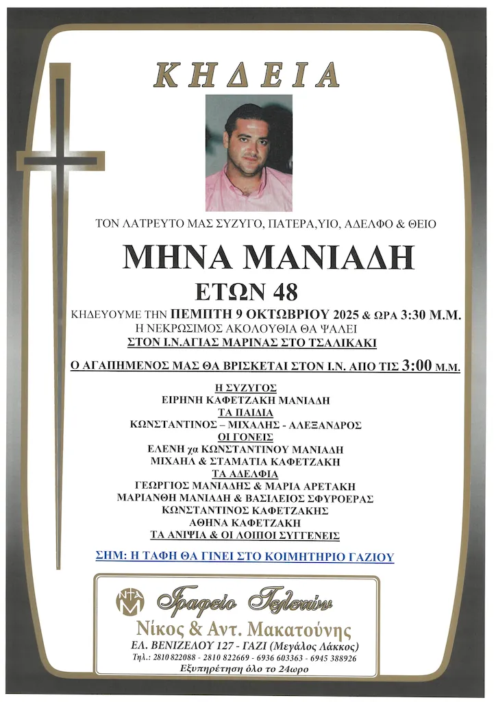 - Η κοινωνία του Ηρακλείου θρηνεί την απώλεια του 48χρονου Μηνά Μανιαδή, πατέρα τριών παιδιών.