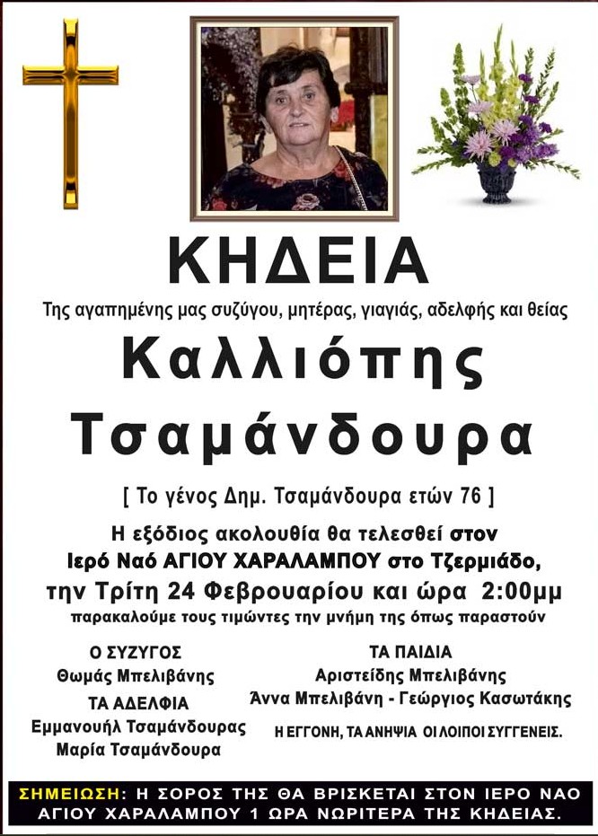 Στο πένθος βυθίστηκε το Τζερμιάδο, μετά την είδηση του θανάτου της Καλλιόπης Τσαμάνδουρα, η οποία έφυγε από τη ζωή σε ηλικία 76 ετών.