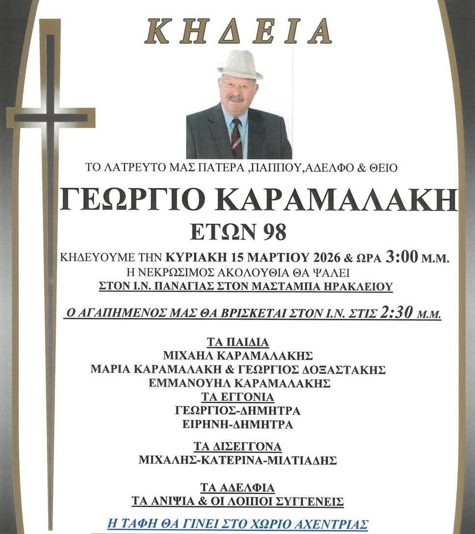 - Η κηδεία θα γίνει στις 15 Μαρτίου στον Ιερό Ναό Παναγίτσας Μασταμπά στις 15:00.