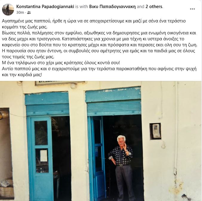 Την είδηση της απώλειας έκαναν γνωστή με ανάρτησή τους τα εγγόνια του, μεταξύ των οποίων είναι και η συνάδελφος δημοσιογράφος Βίκυ Παπαδογιαννάκη: