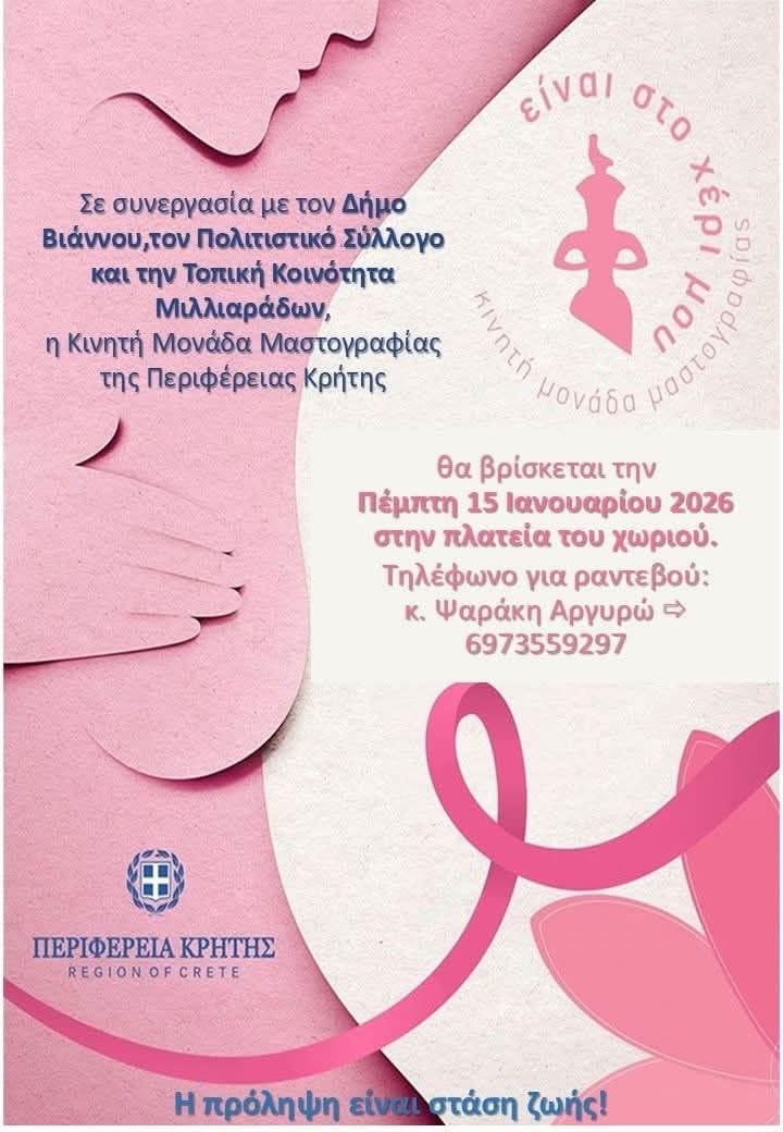 - Η Κινητή Μονάδα Μαστογραφίας της Περιφέρειας Κρήτης επισκέπτεται τη Δημοτική Κοινότητα Μιλλιαράδων στις 15 Ιανουαρίου για δωρεάν εξετάσεις.