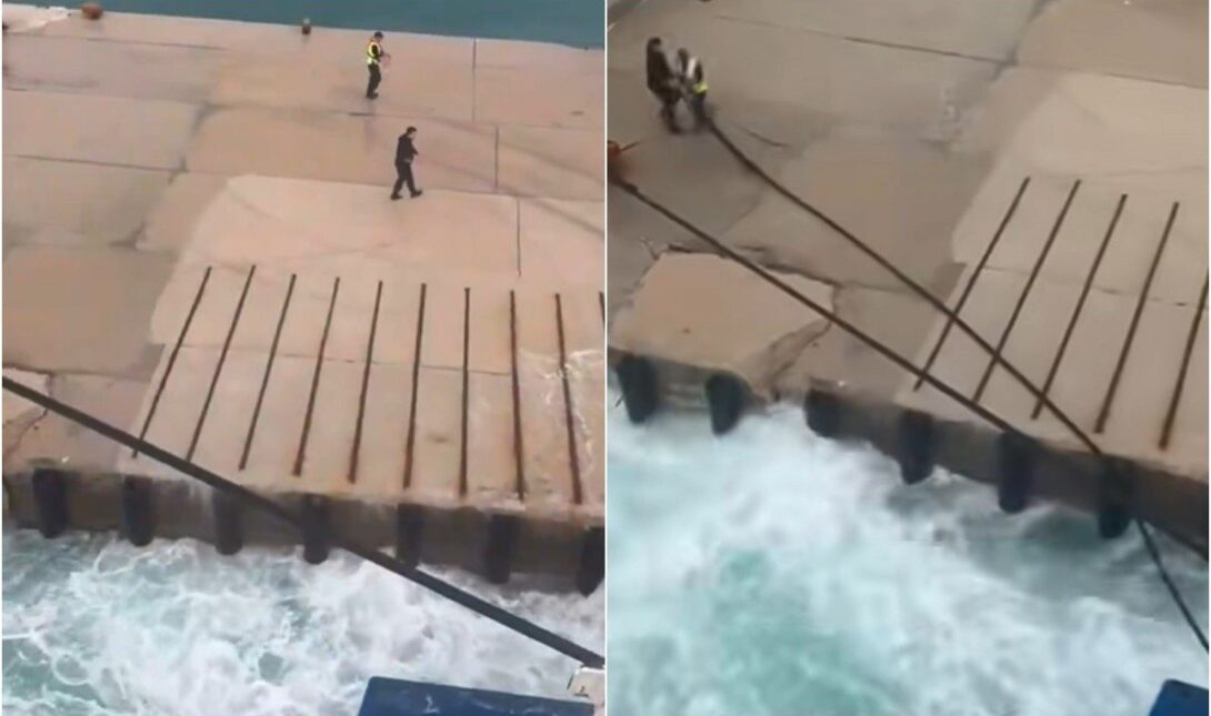 Από τον έντονο κυματισμό που δημιουργείται, τόνοι νερού «πλημμυρίζουν» την αποβάθρα, την ώρα που εργαζόμενοι προσπαθούν να δέσουν τα σχοινιά στον κάβο.