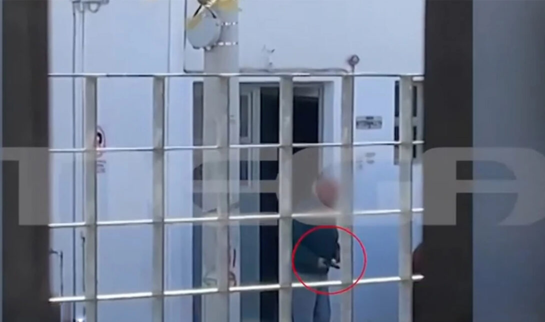 Το βίντεο προβλήθηκε στην εκπομπή Live News και διακρίνεται ο άνδρας ηλικίας περίπου 85 ετών να κρατάει πιστόλι στο χέρι και να πλησιάζει στα κάγκελα, όπου κάτι αναφέρει.
