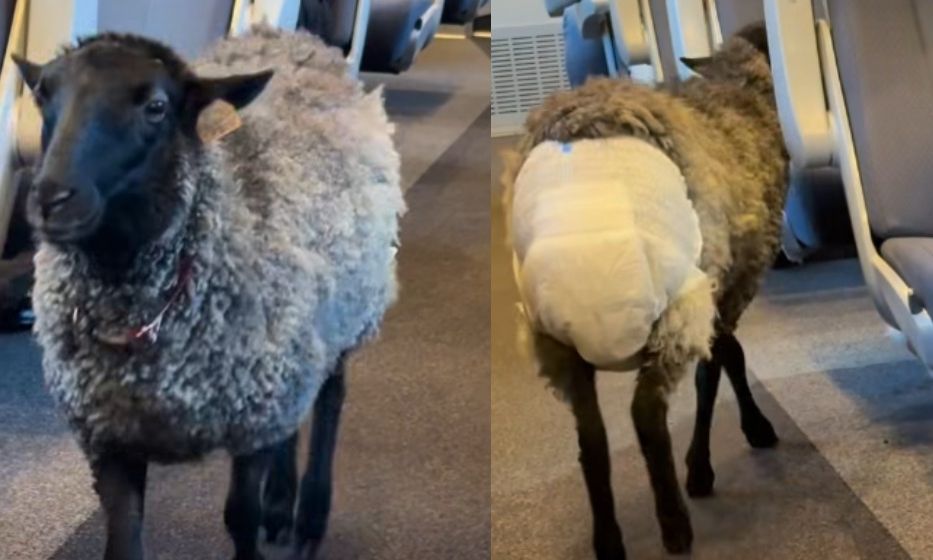 Στο υλικό φαίνεται ένα πρόβατο, ντυμένο με πάνα, να περπατά ατάραχο στον διάδρομο ανάμεσα στα καθίσματα του τρένου.