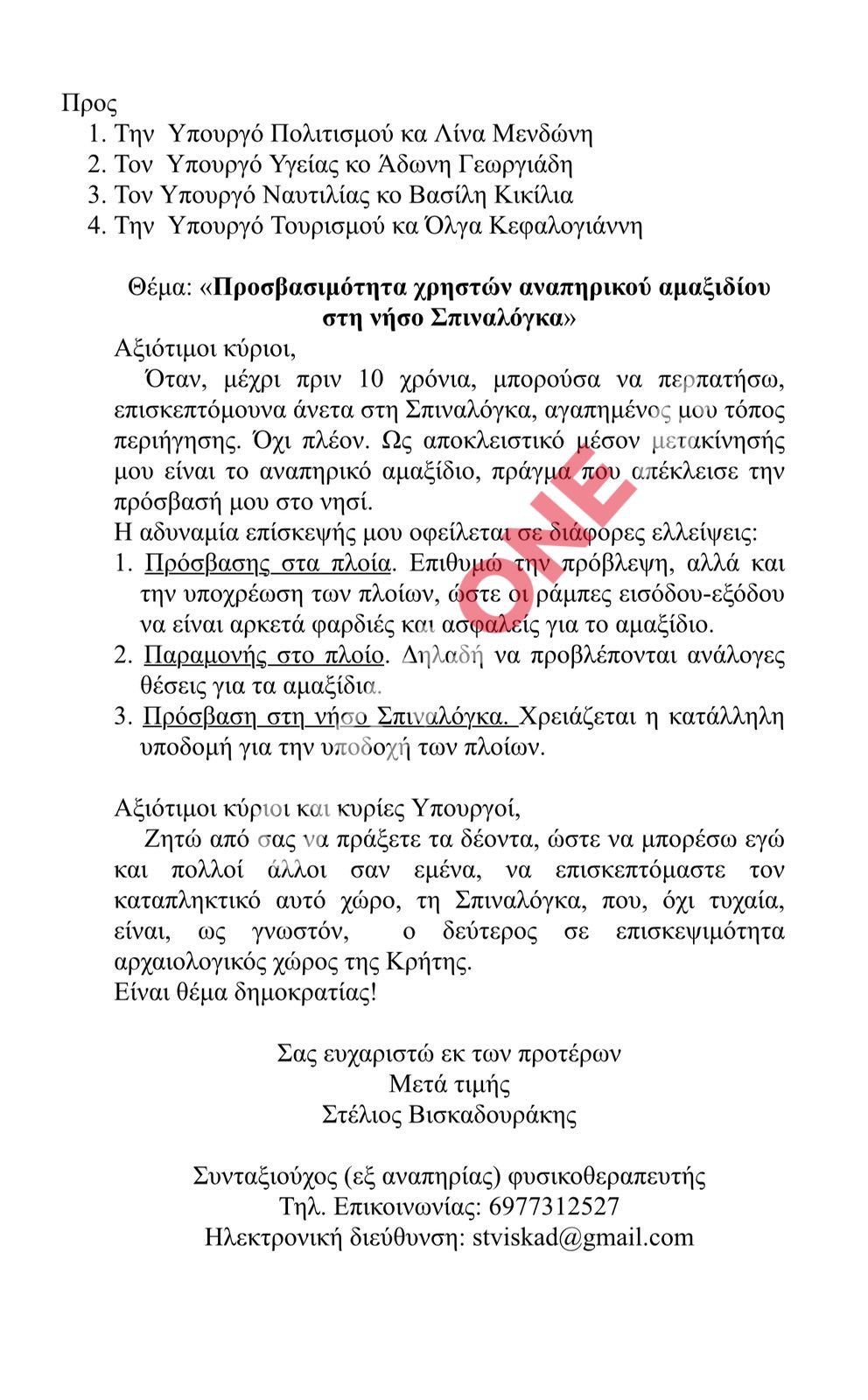Με μια συγκινητική επιστολή προς τέσσερα Υπουργεία, ο Στέλιος Βισκαδουράκης θέτει ένα ζήτημα που θα έπρεπε να είναι αυτονόητο: το δικαίωμα των ατόμων με αναπηρία να έχουν ισότιμη πρόσβαση στη Σπιναλόγκα.