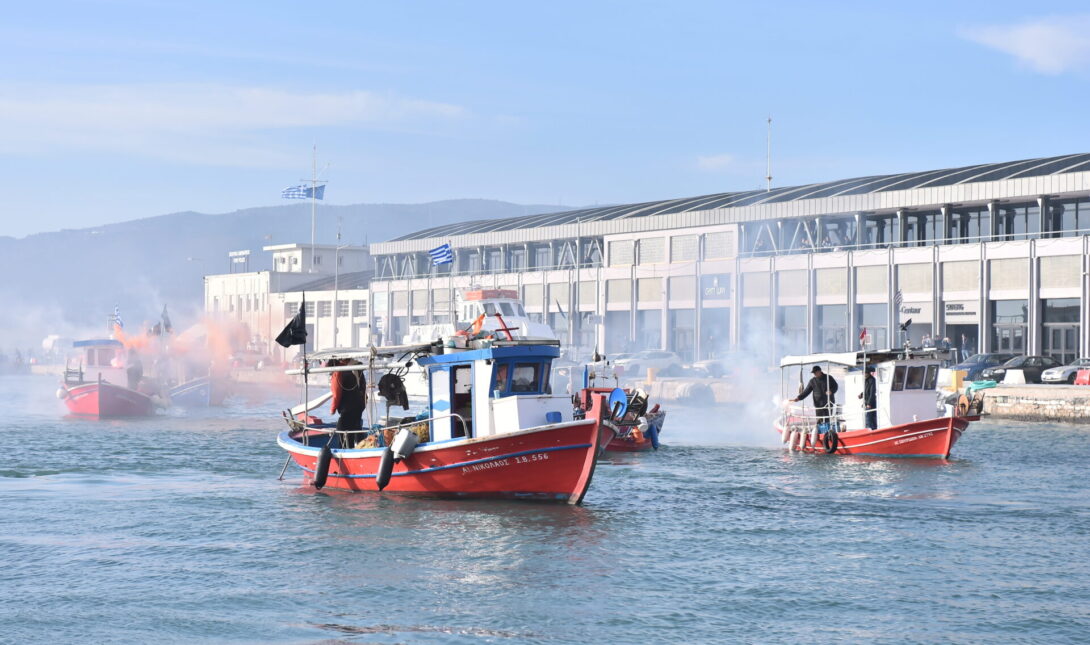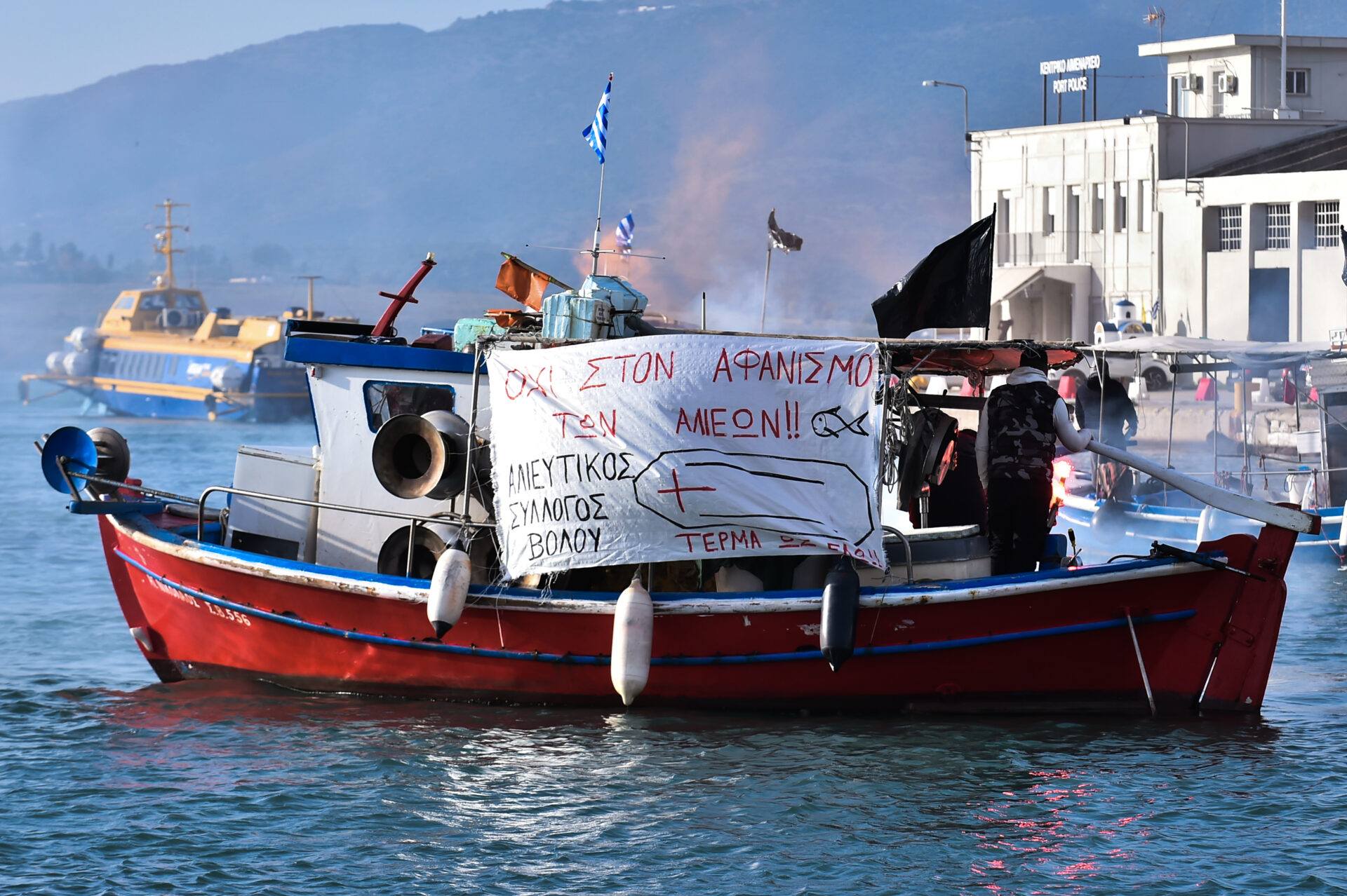 Παράλληλα αποκλεισμό στο λιμάνι επιχειρούν και οι αλιείς του Βόλου από τη θάλασσα.