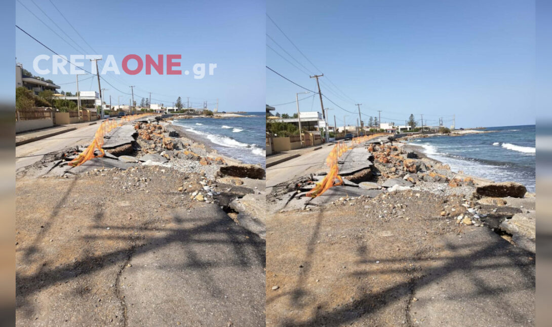 Όπως φαίνεται από τις φωτογραφίες που δημοσιεύει το Cretaone και σήμερα Πέμπτη 5 Μαρτίου, ο δρόμος κατά μήκος της παραλιακής έχει κοπεί σχεδόν από τη μέση, με αποτέλεσμα να υπάρχει μεγάλος κίνδυνος για οδηγούς και πεζούς που κυκλοφορούν στην περιοχή.
