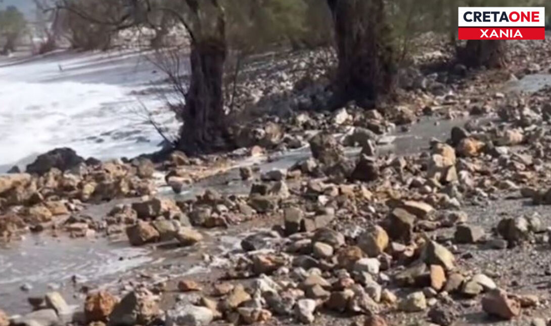 Βομβαρδισμένο τοπίο θυμίζει η παραλία της πόλης της Κισσάμου, με τις πέτρες να έχουν σκορπιστεί σε όλη την ακτή, λόγω των θυελλωδών ανέμων.