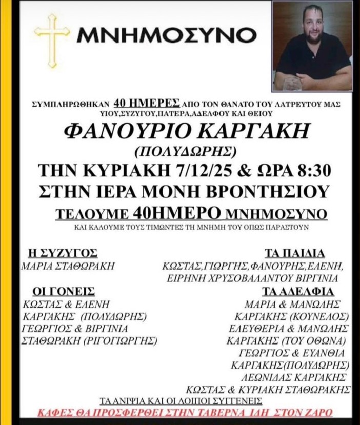 Αύριο Κυριακή 7/12, στις 8:30 θα τελεστεί στην Ιερά Μονή Βροντησίου στον Ζαρό, το σαρανταήμερο μνημόσυνο για την ανάπαυση της ψυχής, τoυ Φανούρη Καργάκη που έπεσε νεκρός μετά από πυροβολισμούς, στα Βορίζια.
