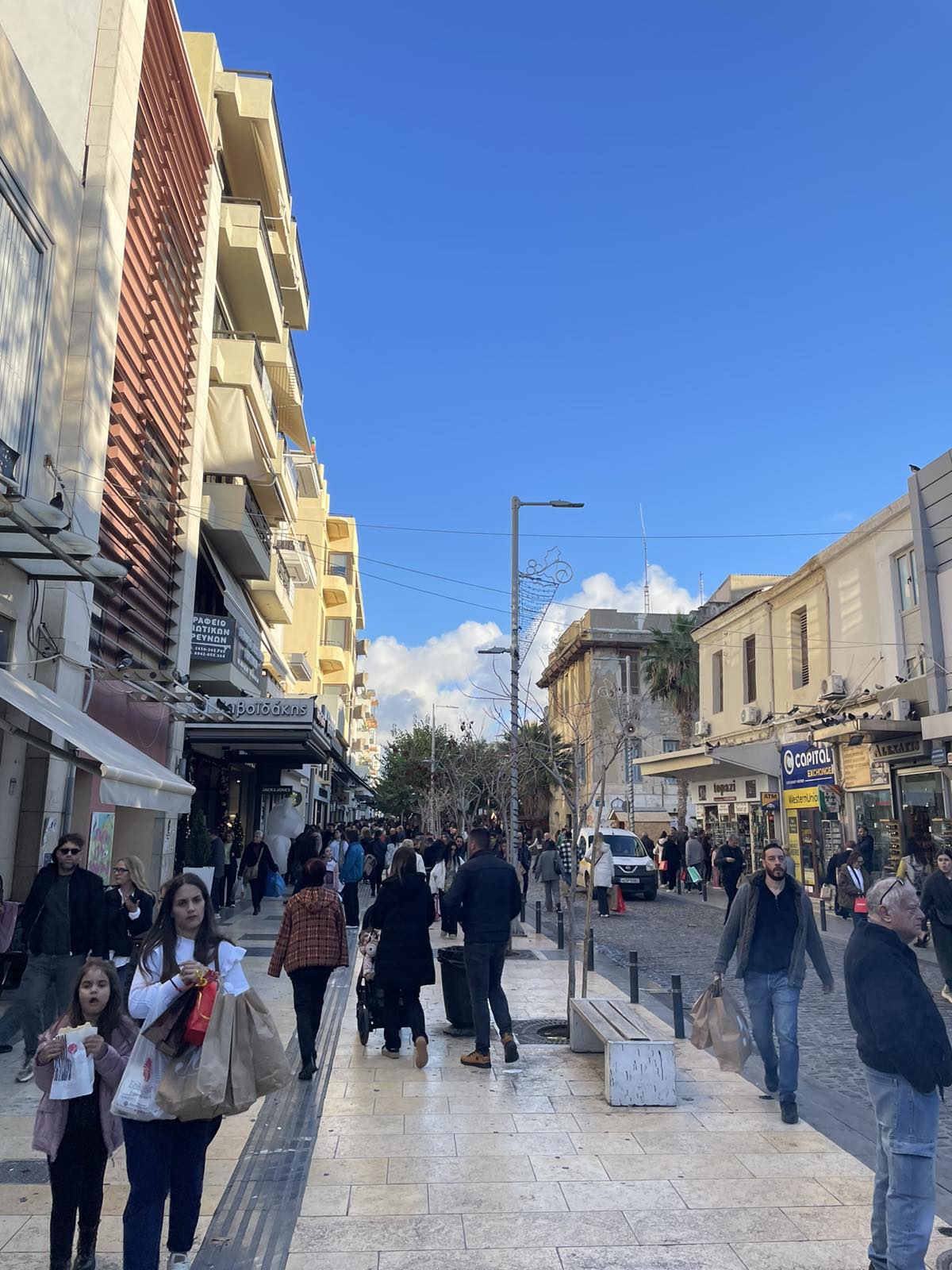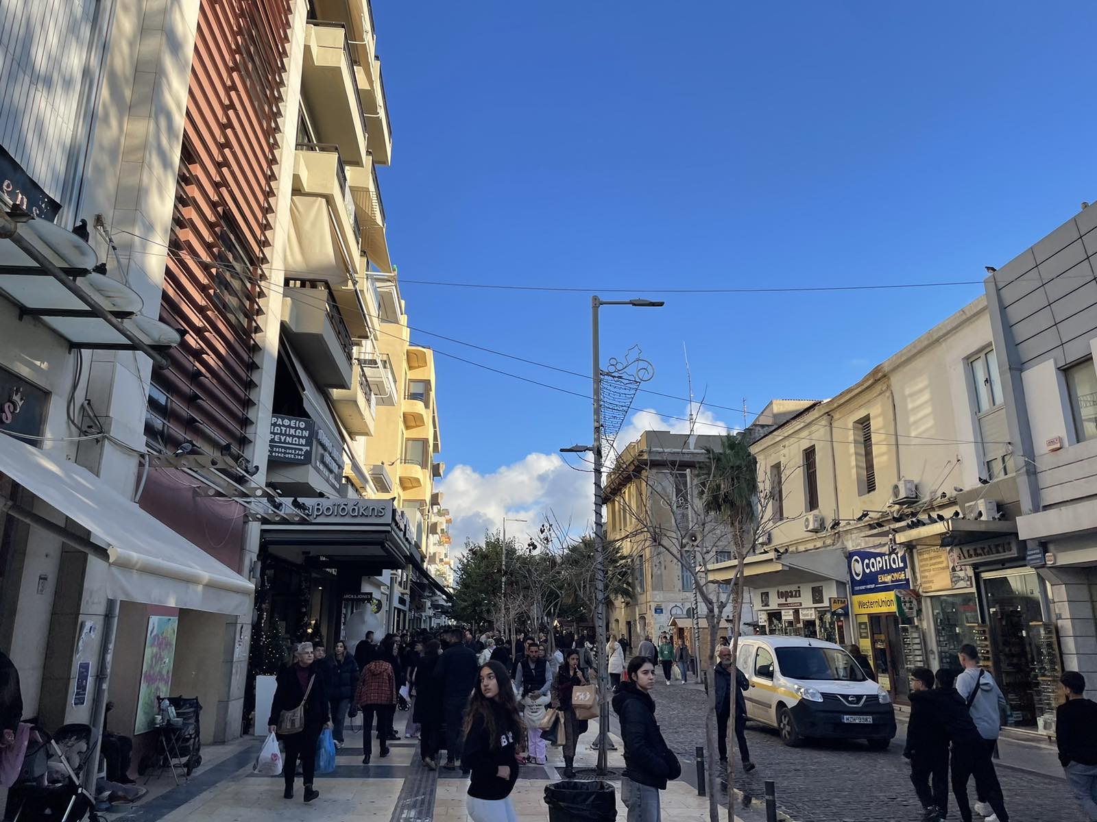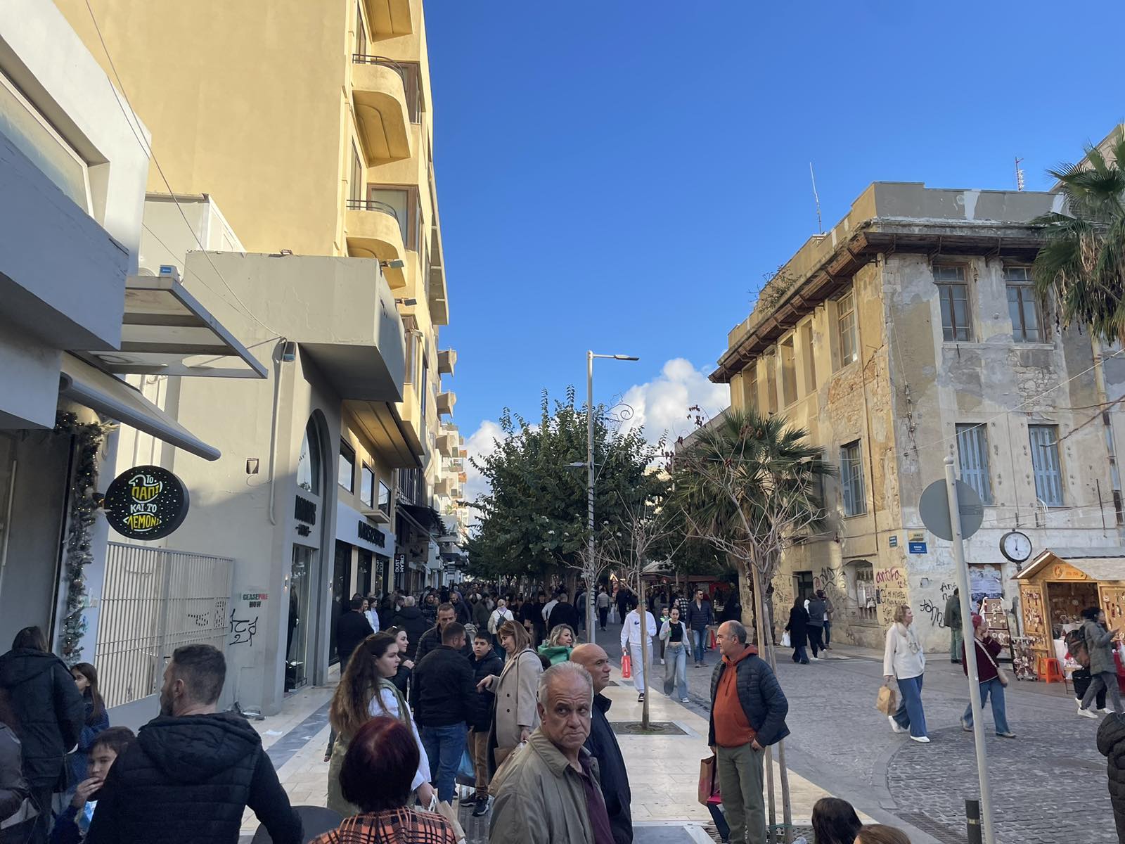 Σε έντονους εορταστικούς ρυθμούς κινείται σήμερα, Κυριακή 21 Δεκεμβρίου, η πόλη του Ηρακλείου, μόλις τέσσερις ημέρες πριν από τα Χριστούγεννα. Το εορταστικό ωράριο και τα ανοιχτά καταστήματα έφεραν από νωρίς το πρωί πλήθος καταναλωτών στο κέντρο, στους εμπορικούς δρόμους και στις αγορές.