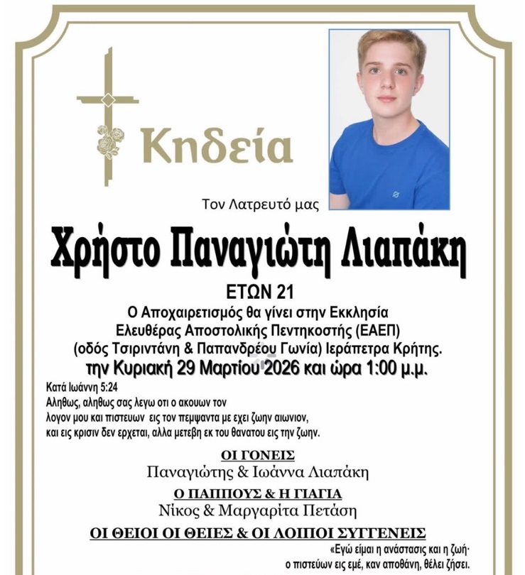 - Η ξαφνική απώλεια του 21χρονου Χρήστου Παναγιώτη Λιαπάκη έχει προκαλέσει βαρύ πένθος στην Ιεράπετρα.
