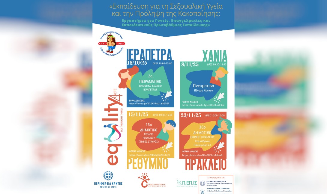 Η Περιφέρεια Κρήτης, μέσω του Αυτοτελούς Γραφείου Ισότητας και η Α.ΞΕ.Π.Τ. Ασφαλή Ξένοιαστα Παιδιά Τώρα σε συνεργασία με τη Διεύθυνση Π.Ε. Ν. Χανίων, των Συμβούλων Εκπ/σης ΠΕ60, Πε70 και τον Δήμο Χανίων – Δημοτική Επιτροπή Ισότητας των Φύλων (Δ.ΕΠ.ΙΣ.) Χανίων, σας προσκαλούν να συμμετάσχετε στο επιμορφωτικό πρόγραμμα που θα υλοποιηθεί στα Χανιά, το Σάββατο 8 Νοεμβρίου 2025 τις ώρες 9.30 – 14.30 στο Πνευματικό Κέντρο Χανίων, με τίτλο: