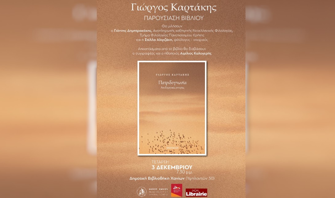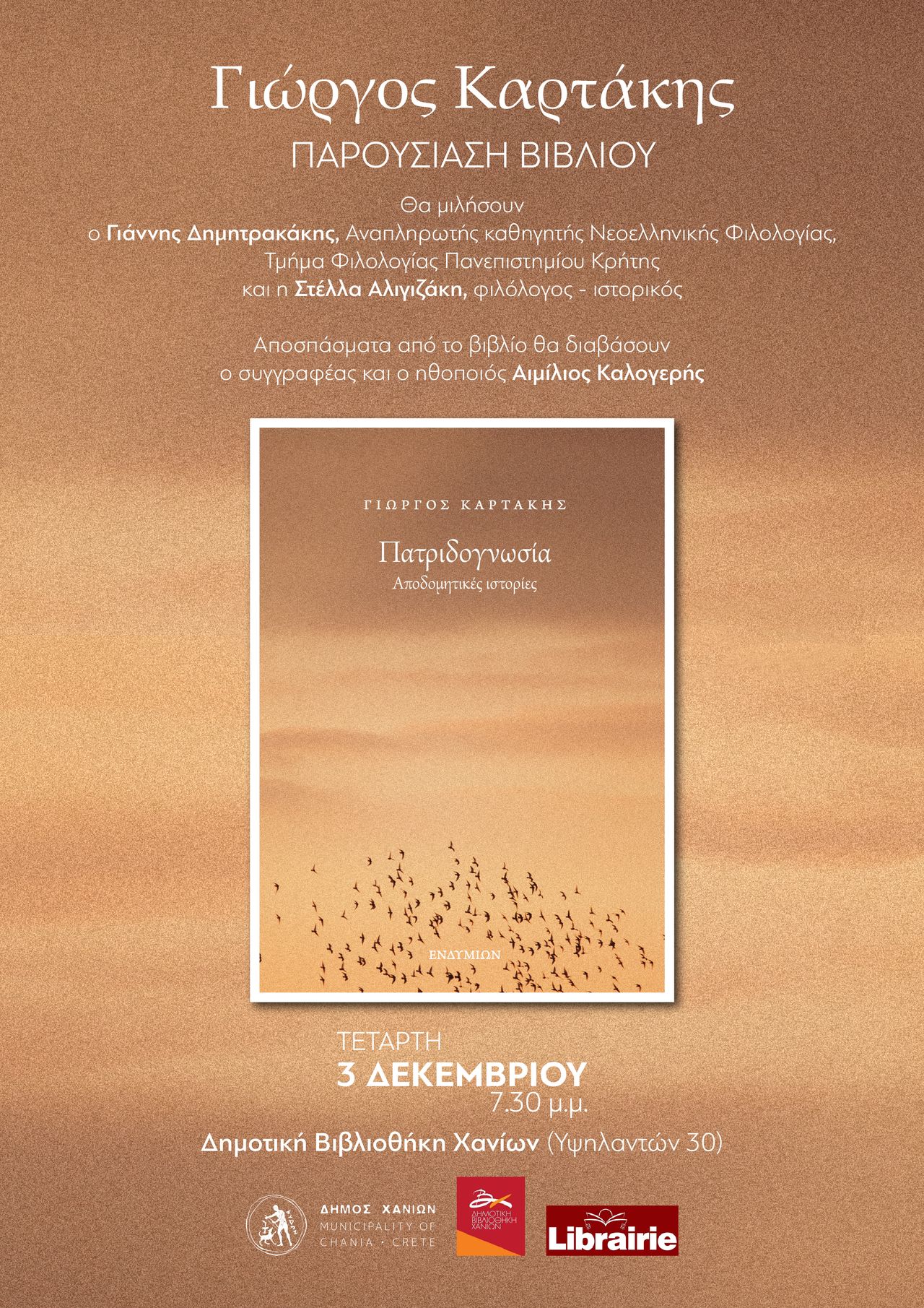 Ο Δήμος Χανίων, η Δημοτική Βιβλιοθήκη Χανίων, το βιβλιοπωλείο Librairie και οι εκδόσεις ΕΝΔΥΜΙΩΝ διοργανώνουν την παρουσίαση του βιβλίου του Γιώργου Καρτάκη με τίτλο «Πατριδογνωσία», την Τετάρτη 3 Δεκεμβρίου, στις 7:30 μ.μ., στη Δημοτική Βιβλιοθήκη Χανίων (Υψηλαντών 30).
