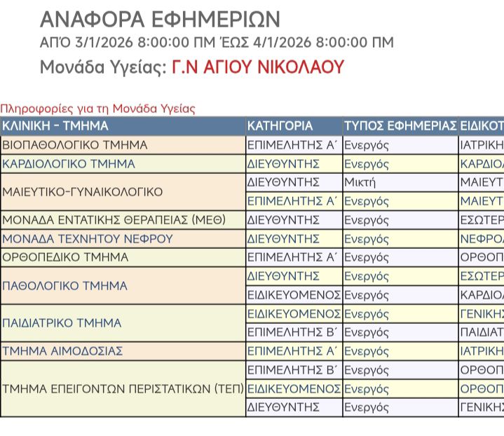 Πιο συγκεκριμένα, λόγω έλλειψης γιατρών, στο Νοσοκομείο Αγίου Νικολάου δεν εφημερεύει αναισθησιολόγος, ακτινολόγος ούτε γενικός χειρουργός.