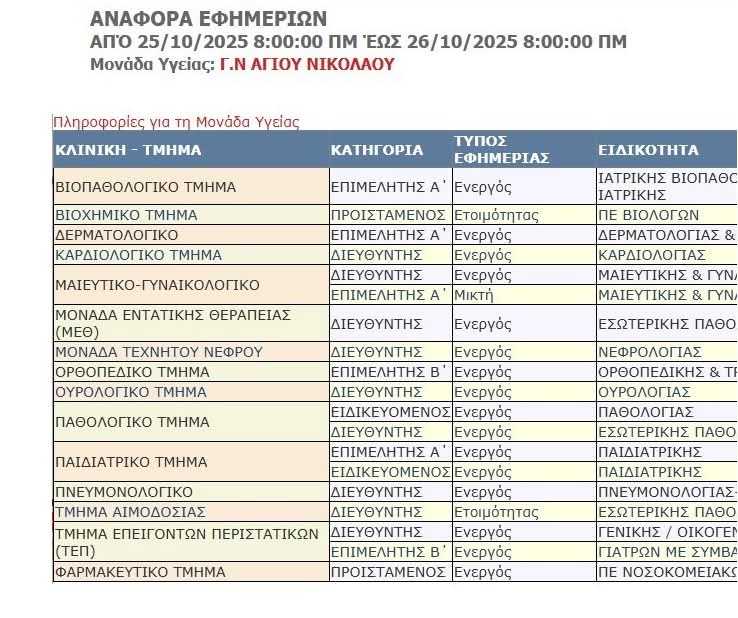 Σήμερα Σάββατο 25/10/25 λόγω έλλειψης ιατρών στο νοσοκομείο Αγίου Νικολάου δεν εφημερεύει αναισθησιολόγος, ούτε ακτινολόγος, ούτε γενικός χειρουργός.